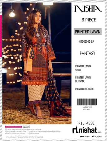 NISHA BY NISHAT Luxury Lawn 3 Piece Suit *Description Digital Print Lawn Shirt. Digital Print Voile Lawn Dupatta. Dyed Cambric Trousers. PRICE 60 SAR With Original Packing Please contact 0545490975